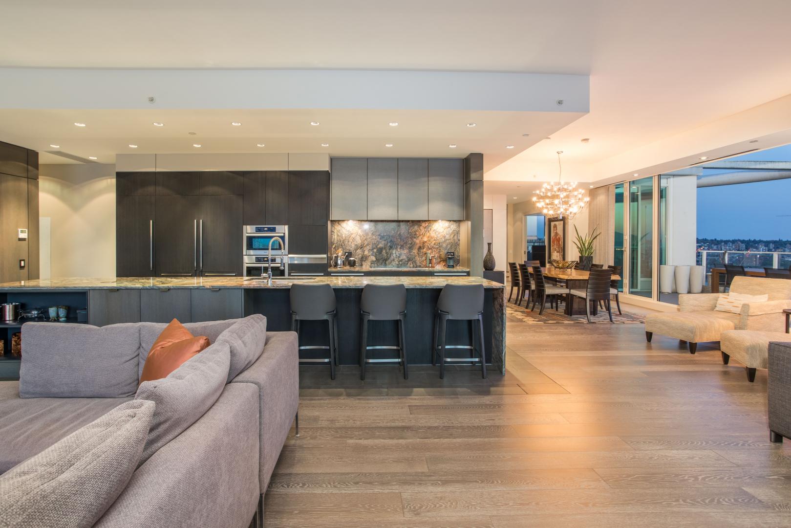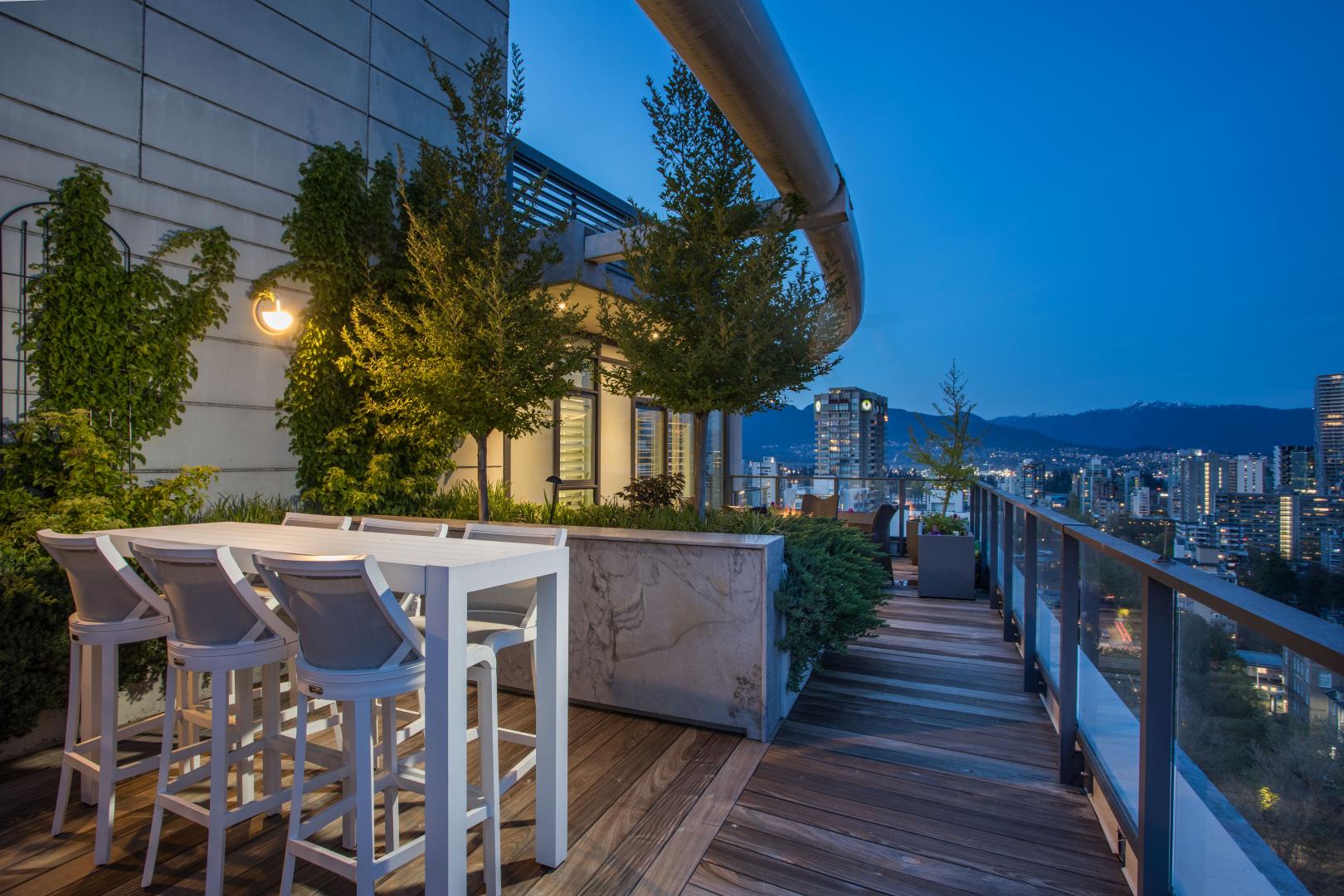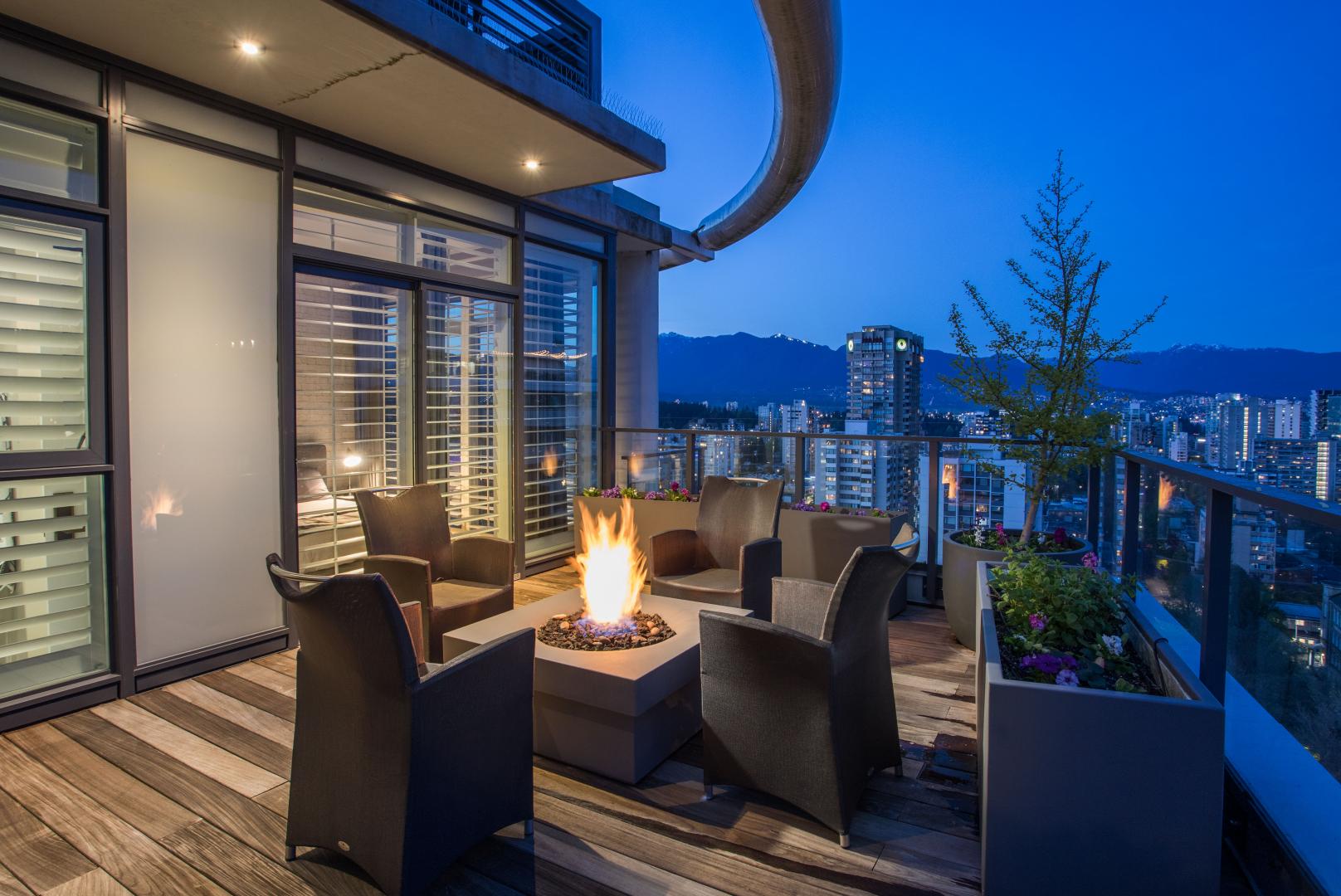 The English Bay Penthouse! Full-floor-2,850 sf PH with 1,500 sf of outdoor space w/ private elevator access and breathtaking all day & night views. Redesigned by Fay Mihailides Design in 2020, it features an 18-ft Wow Fusion kitchen island, Siena tile floors w/ bronze inlay, rift-cut oak wall panels, Rocky Mountain brass hardware, Moooi padded feature walls and custom alabaster lighting. Private primary retreat includes a spa-like ensuite and secluded patio w/ water & mtn views. Two additional ensuite bedrooms also boast private patios and mountain vistas. Two large terraces with multiple lounge zones,lush irrigated gardens & a full outdoor kitchen with Heston BBQ. Rare private 5-car garage outfitted w/ epoxy flooring & smart storage solutions. A true gem! Your only mission is to get home!