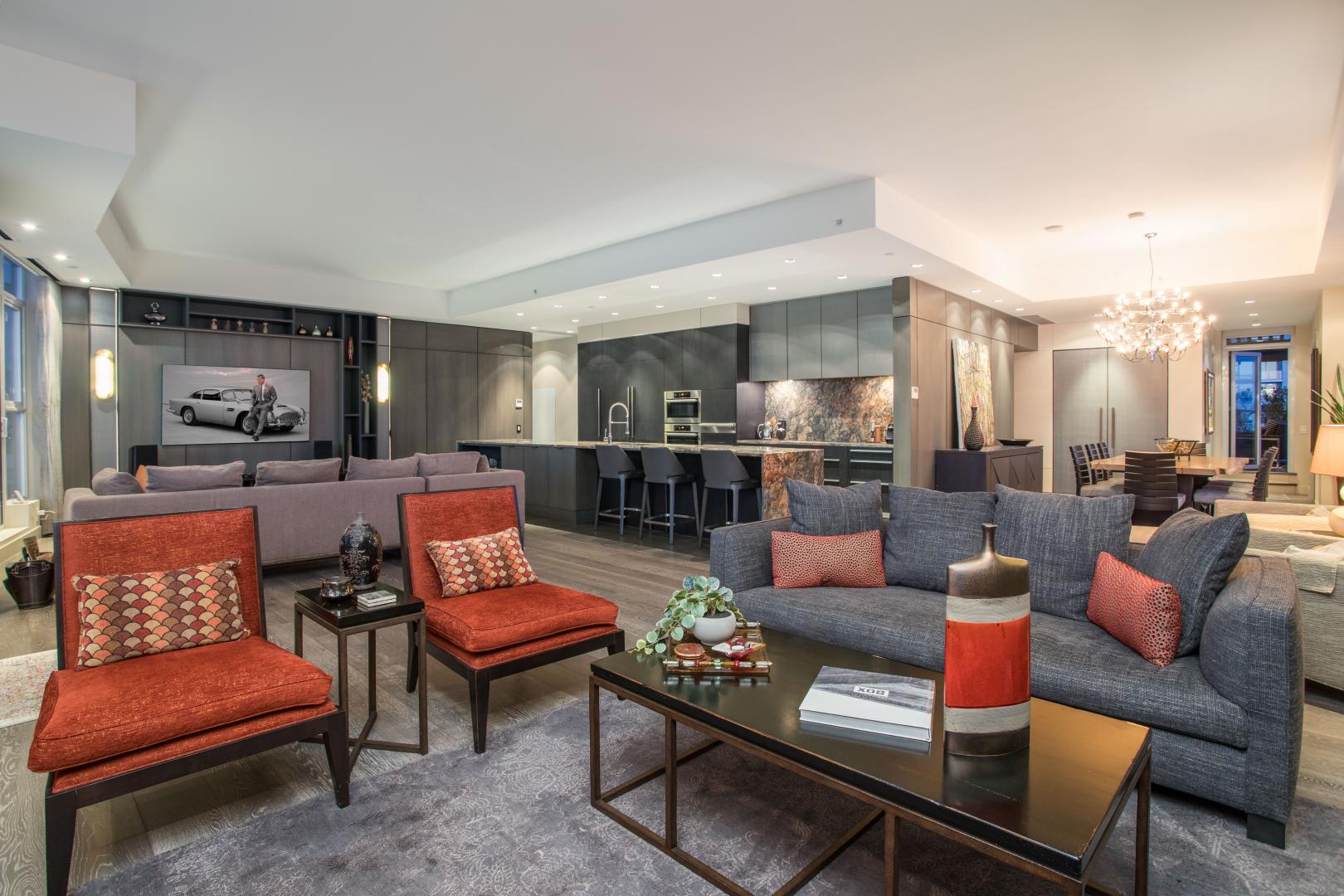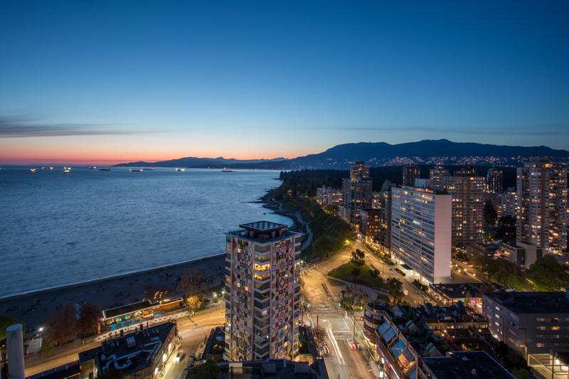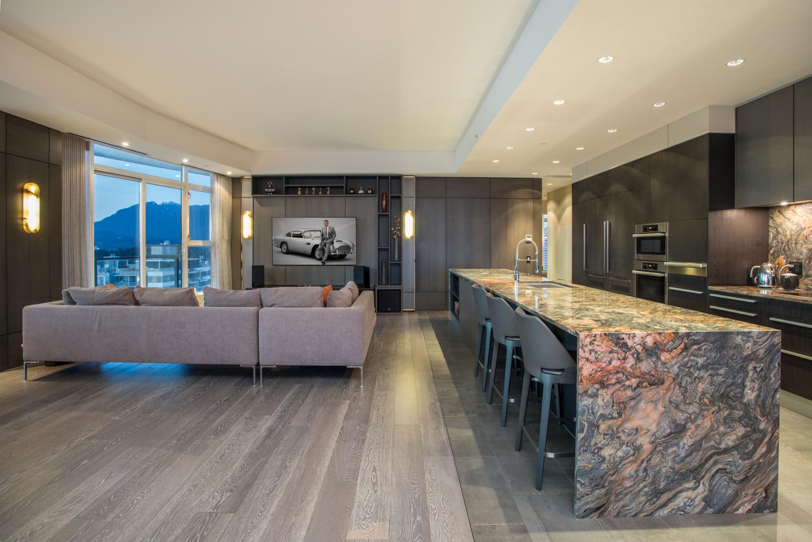The English Bay Penthouse! Full-floor-2,850 sf PH with 1,500 sf of outdoor space w/ private elevator access and breathtaking all day & night views. Redesigned by Fay Mihailides Design in 2020, it features an 18-ft Wow Fusion kitchen island, Siena tile floors w/ bronze inlay, rift-cut oak wall panels, Rocky Mountain brass hardware, Moooi padded feature walls and custom alabaster lighting. Private primary retreat includes a spa-like ensuite and secluded patio w/ water & mtn views. Two additional ensuite bedrooms also boast private patios and mountain vistas. Two large terraces with multiple lounge zones,lush irrigated gardens & a full outdoor kitchen with Heston BBQ. Rare private 5-car garage outfitted w/ epoxy flooring & smart storage solutions. A true gem! Your only mission is to get home!